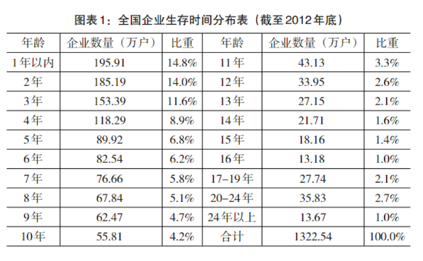 我能找到的官方權威報告是原國家工商總局2013年發布的《全國內資企業生存時間分析報告》,據此報告,截至2012年底,全國1322.54萬戶內資企業中,生存時間五年以下的占企業總量的接近一半(49.4%);