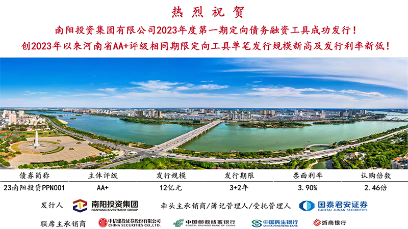 10月26日,南陽投資集團2023年第一期定向融資工具(23南投集團PPN001)成功發行,金額12億元,期限3+2年,票面利率3.90%,全場倍數2.46倍,聯席主承銷商為國泰君安證券、中信建投證券、郵儲銀行、民生銀行、浙商銀行,創2023年以來河南省AA+評級相同期限定向工具單筆發行規模新高及發行利率新低!