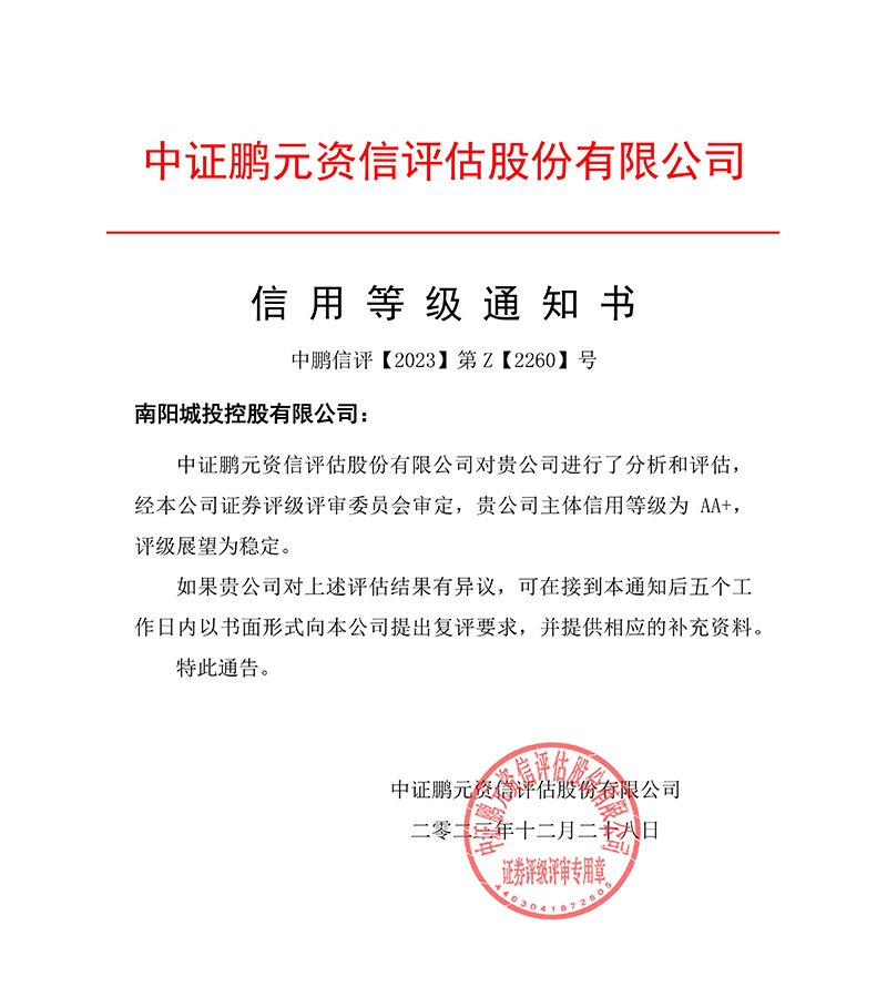 近日,經國內權威評級機構中證鵬元資信評估股份有限公司評定,南陽城投控股有限公司(以下簡稱南陽城投控股)榮獲AA+主體信用評級,評級展望為穩定。
