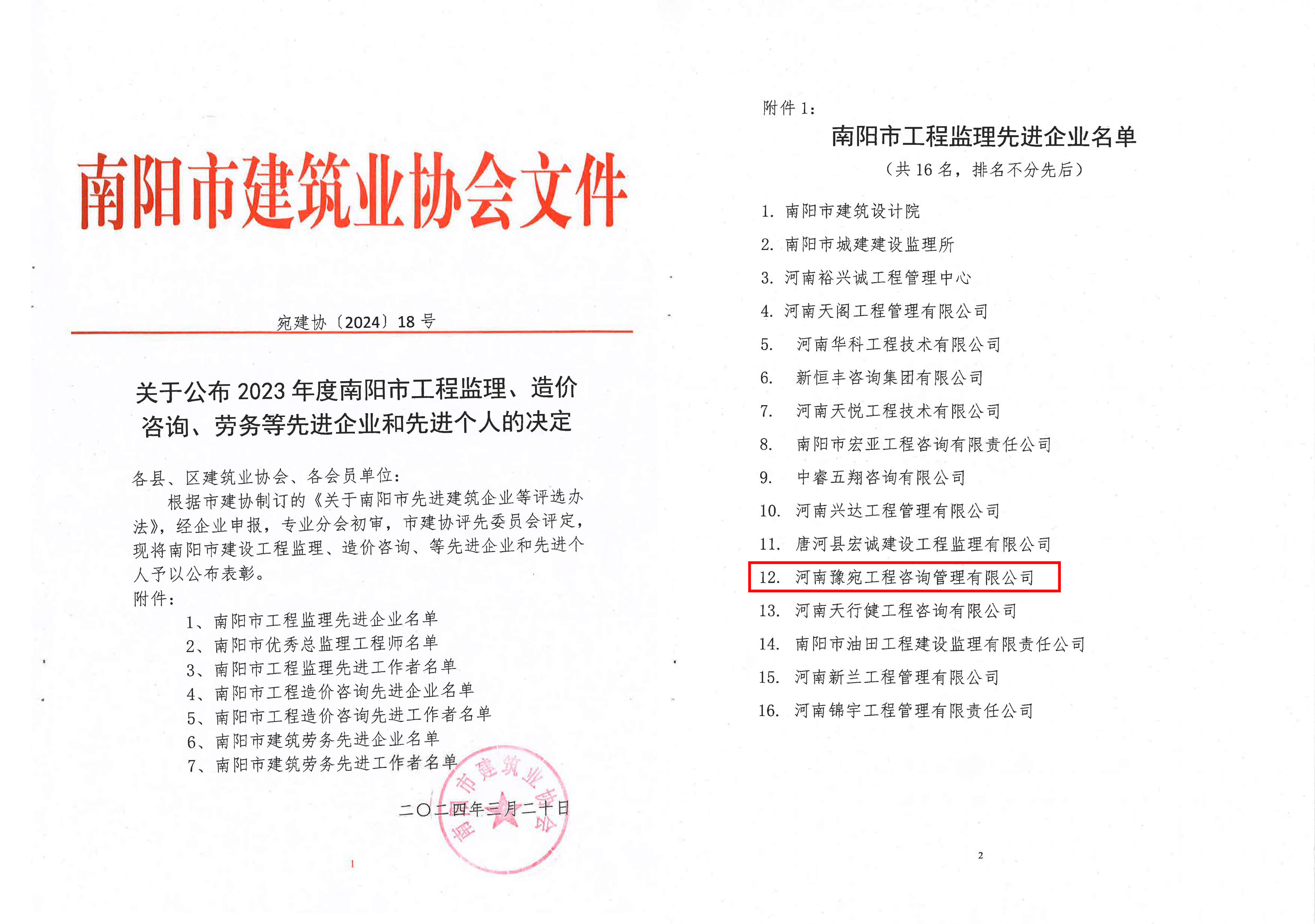 3月25日,南陽市建筑業協會召開第六屆第二次會員大會,會議公布并表彰了2023年度南陽市工程監理、造價咨詢、勞務等先進企業和先進個人,集團下屬河南豫宛工程咨詢管理有限公司(簡稱:豫宛咨詢公司)榮獲南陽市建筑業協會頒發的“2023年度南陽市工程造價咨詢先進企業”和“2023年度南陽市工程監理先進企業”兩項殊榮,公司員工王虎、張曉楠、鄭詳文3人獲得“2023年度南陽市工程造價咨詢先進工作者”榮譽稱號。